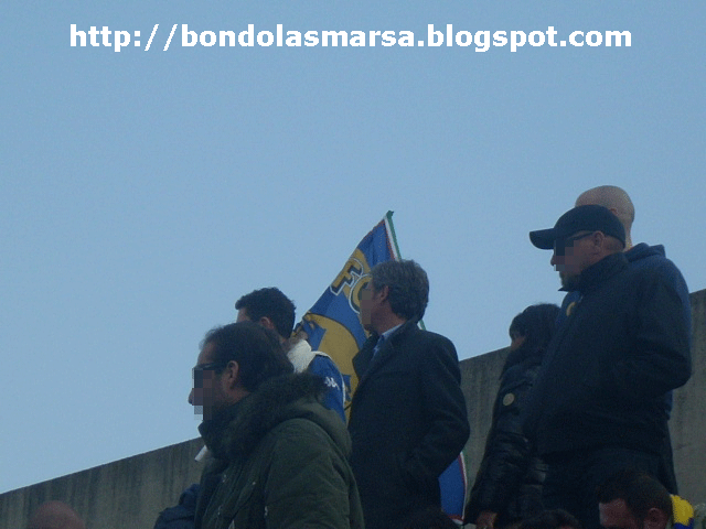 Ore 14 o giù di lì + 5 minuti: Bridget nota bandiere appese alle ringhiere, c'è anche uno striscione! Perchè quello di BONDOLA/=\SMARSA no? E' vero... Perchè quello nostro no? Ci riprovo, scendo dai poliziotti e chiedo cortesemente di ripensarci: "Ma quello vostro è troppo grosso!" e io: "Suvvia commissario sia buono... E' solo uno striscione! Mica è 'na bomba!", aiutato da un paio di pulotti "complici", che evidentemente mi hanno preso in simpatia, lo conviciamo! Che emozione! Lo striscione B/=\S esordirà in trasferta veramente dopo il semi battesimo del fuoco a La Spezia... Lo vado a prendere ma devo ricominciare la trafila sia in uscita che in entrata: che significa BONDOLA SMARSA? Eccheppalle! Però alla fine lo striscione prende il sole sulle ringhiere della scalinata dello Speroni, questo è quello che conta... Saluto i butèi di Ala e quelli del Comitato, c'è anche Aquilante con una bombetta in testa! Ma quanti copricapi ha? Boh... Comincia la partita.